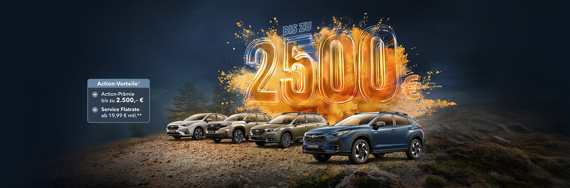 1 Die Aktion gilt vom 29.12.2025 bis 31.03.2026 in Verbindung mit dem Kauf eines aktuellen Subaru Impreza, Crosstrek, Outback oder Forester (Neu- oder Vorführwagen), Zulassung/Besitzumschreibung bis 30.06.2026 bei teilnehmenden Subaru Partnern. Die Aktion wird gemeinsam von der SUBARU Deutschland GmbH und den teilnehmenden Subaru-Partnern getragen und ist nicht mit anderen Aktionen der SUBARU Deutschland GmbH kombinierbar mit Ausnahme des Aktionsangebots zur Service-Flatrate. Sie sparen je nach Modell bei Kauf eines Subaru Crosstrek oder Impreza (MJ 2023/2024): 2.500,-€, eines Crosstrek oder Impreza (MJ 2025/2026): 1.200,-€, eines Outback (MJ 2024): 1.000,-€; eines Outback (MJ 2025): 2.000,-€, oder eines Forester (ab MJ 2025): 1.000,-€. Weitere Detailinformationen erhalten Sie bei Ihrem teilnehmenden Subaru Partner oder unter www.subaru.de.